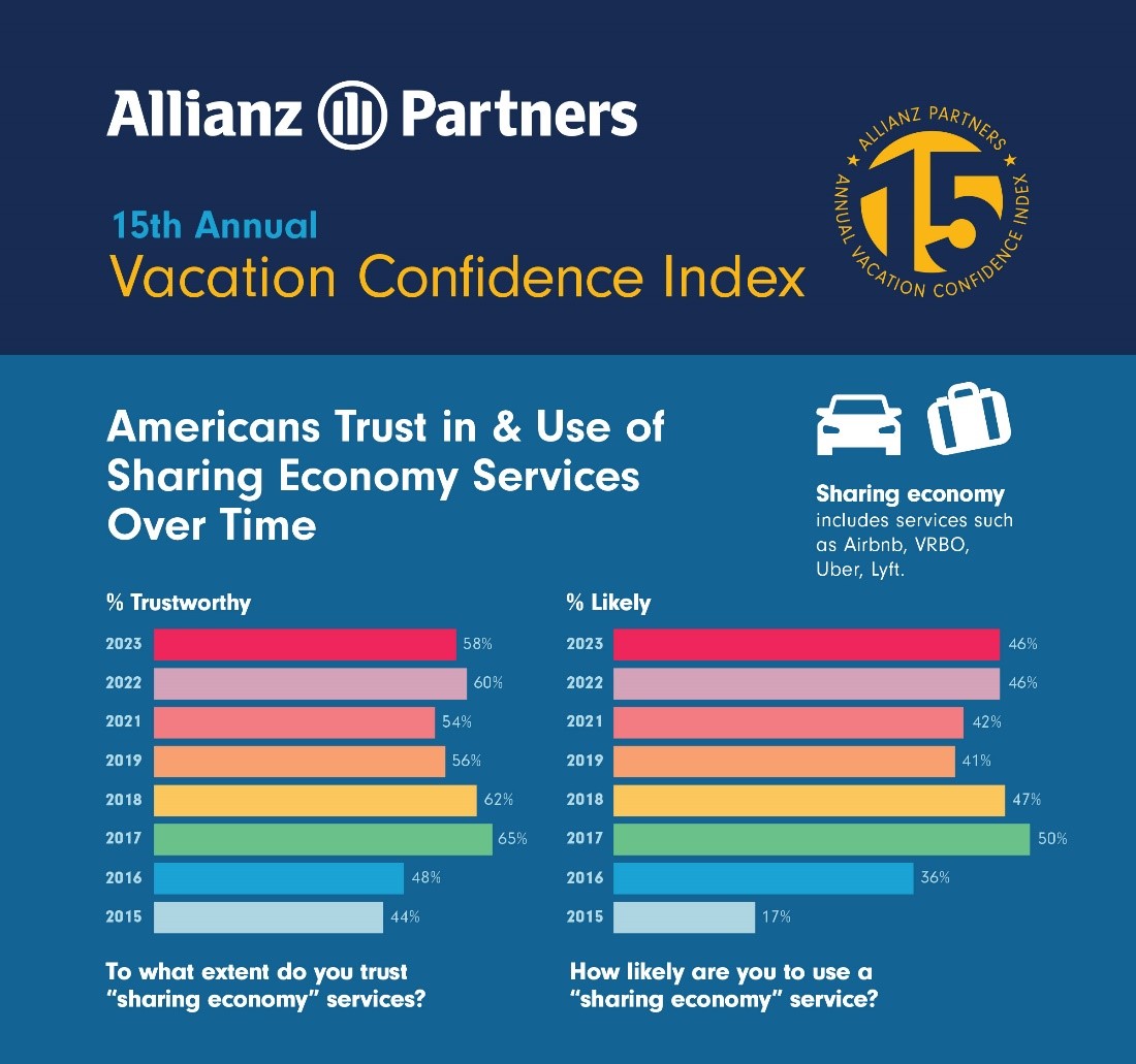 Richmond, Virginia, July 17, 2023 - Travel is back in full swing with Americans declaring an annual summer vacation one of their top priorities this year. While airlines, hotels and cruises have rebounded, the use of sharing economy services like ridesharing and vacation property rentals remain an integral part of the travel equation. Allianz Partners’ 15th Annual Vacation Confidence Index reveals that almost half (46%, unchanged from 2022) of Americans are likely to use sharing economy services while they’re away from home this summer season. The survey also found that for two years in a row, trust in the sharing economy has remained high with three in five (58%) deeming them trustworthy.